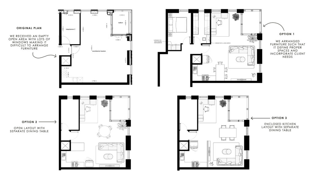 Final layouts clearly defined zones while retaining an open, airy feel.