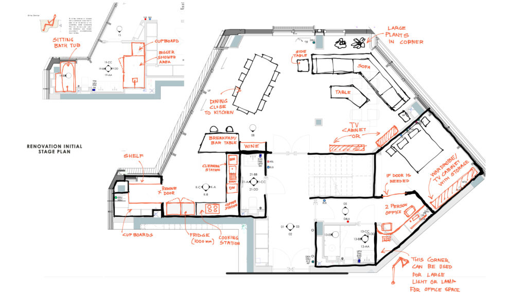 Requirements included bedroom, two-person office, kitchen with pantry, dining, and living areas.